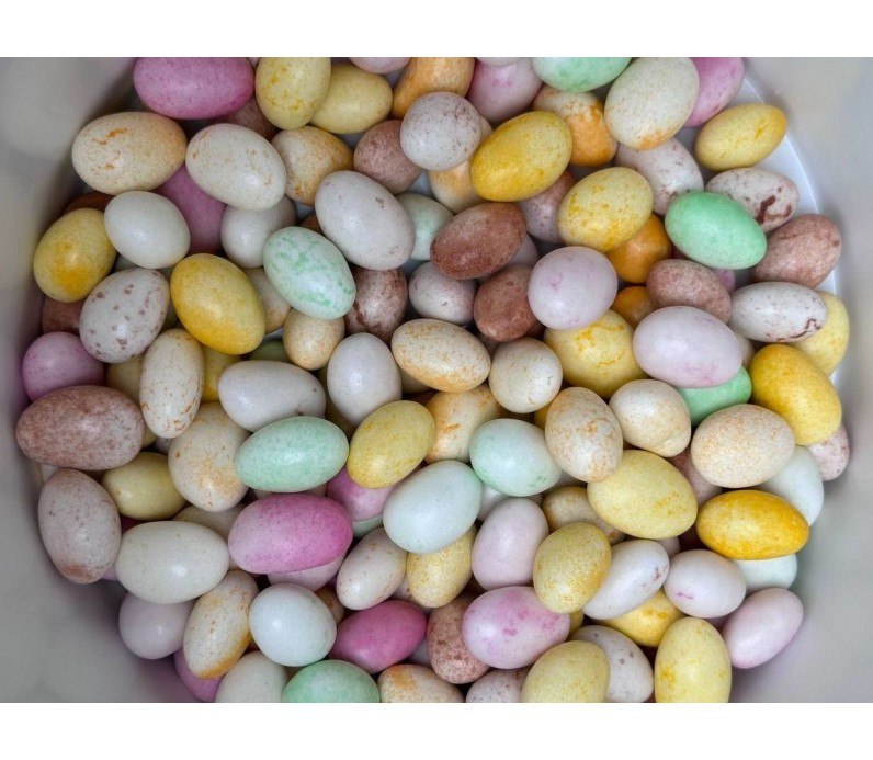 Декор – шоколадні різнокольорові плямисті яєчка з м’якою начинкою з фундука в хрусткій оболонці. Розмір 25 мм*15 мм.