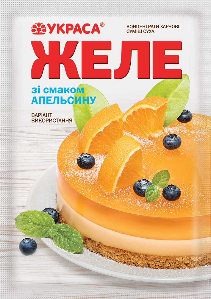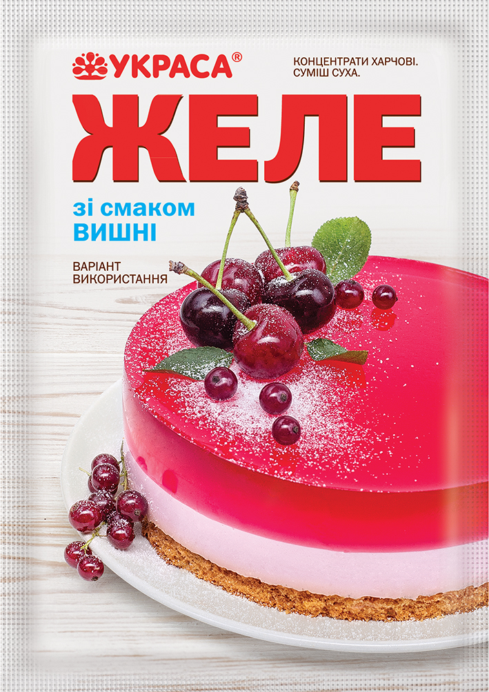 Суміш для швидкого приготуваня желе з вишневим смаком та ароматом, вишневого кольору. Потрібно додати 2 склянки води.